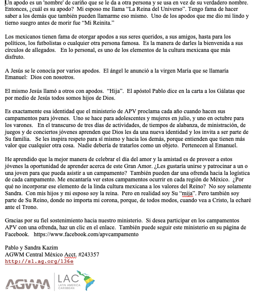 Si desea donar en línea a nuestro ministerio, se puede hacer en el siguiente enlace. ¡Gracias mil! https://s1.ag.org/kazim2